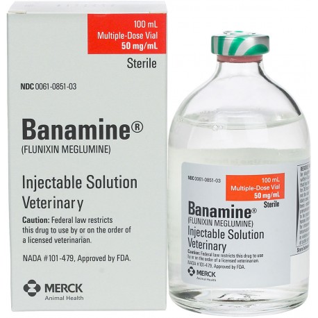 Banamine Injectable Solution in as anti-inflammatory and analgesic. Used in horses for the alleviation of inflammation and pain associated with musculoskeletal disorders and for the alleviation of visceral pain associated with colic. Banamine Injectable Solution is used in cattle for the control of pyrexia (fever) associated with bovine respiratory disease and endotoxemia, and for the control of inflammation in endotoxemia. Each ml of Banamine Injectable Solution contains flunixin meglumine equivalent to 50 mg flunixin.
